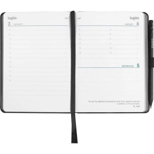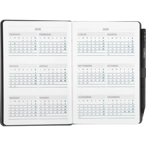 Ogni giorno è un'avventura da scrivere, e con questa agenda hai tutto ciò che ti serve per farlo. La sua copertina nera, con una texture quasi puntinata, non è solo elegante ma anche pratica da maneggiare. Compatta e robusta, è pensata per chi è sempre in movimento. Grazie alla matita Comix sempre a portata di mano nell'apposito elastico, non perderai mai un'idea. L'interno è un concentrato di efficienza: una pagina per ogni giorno, un doppio segnalibro per non perdere il segno, una tasca per i tuoi documenti e fogli pretagliati per le note al volo. È il quartier generale tascabile per i tuoi impegni del 2026.