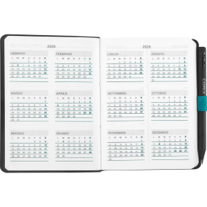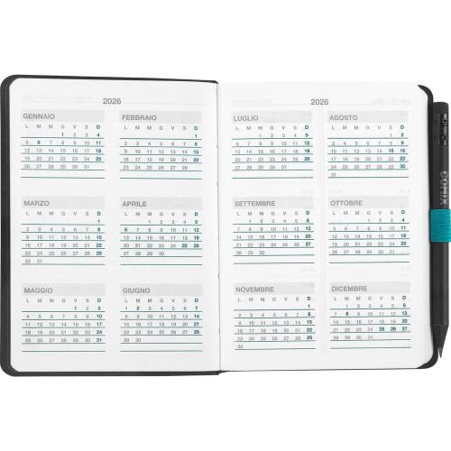 Altre specifiche: 12 mesi (Gen-Dic 2026), layout giornaliero, chiusura elastica, doppio segnalibro