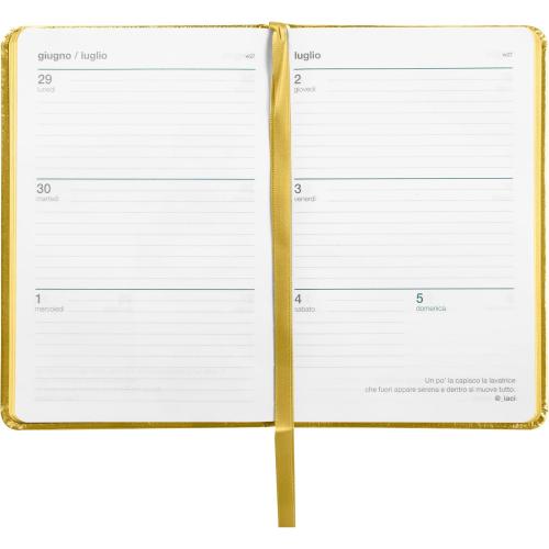 Trasforma la tua organizzazione in una pura affermazione di stile. L'agenda Comix Week 2026 non è solo uno strumento per pianificare, ma un vero e proprio accessorio fashion che cattura la luce e l'attenzione. La sua copertina, di un oro ricco e scintillante, è impreziosita dal logo Comix realizzato con brillanti strass: un dettaglio glam che, unito al suo pratico formato da 11x16 cm, la rende perfetta da sfoggiare sulla scrivania o da infilare agilmente in borsa. All'interno, il design intelligente ti offre il pieno controllo della settimana: con un solo colpo d'occhio, hai la visione completa dei tuoi impegni, con uno spazio dedicato sulla destra per le note, le liste e le idee geniali. Ogni pagina è resa unica dagli inconfondibili aforismi Comix, pronti a regalarti un sorriso o uno spunto di riflessione. Dettagli pratici come il segnalibro in nastro dorato, la tasca interna per custodire biglietti e piccoli tesori, e le pagine finali staccabili, la rendono l'alleata perfetta per un anno vissuto da protagonista.
