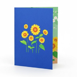 Regala un'emozione indimenticabile, non un semplice biglietto. Con la Card Pop-Up Girasoli di Origamo, trasformi un momento di auguri in una vera e propria esperienza di meraviglia: quella che sembra una semplice copertina blu si apre per svelare un campo fiorito tridimensionale che lascia senza fiato.