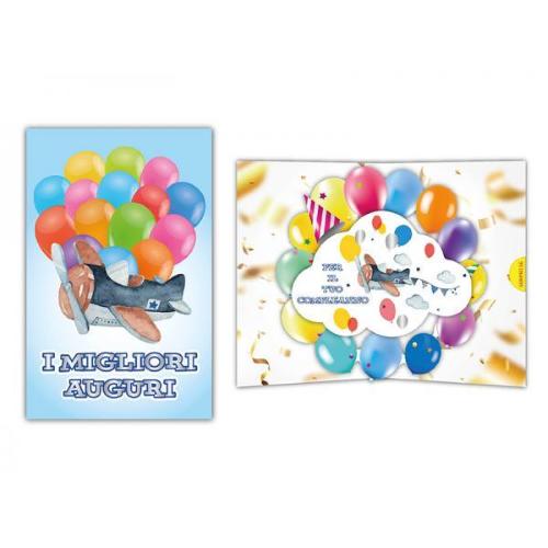 Esterno: Illustrazione con aeroplano e palloncini, scritta "I Migliori Auguri".