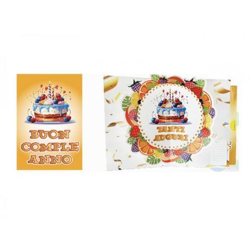 Cerchi un modo per fare degli auguri che siano tanto dolci quanto indimenticabili? Questo biglietto è una vera e propria festa in miniatura. La copertina, con la sua appetitosa torta, è solo un assaggio della sorpresa che si nasconde all'interno. All'apertura, un'incredibile esplosione di colori e freschezza prende vita: una magnifica torta si solleva al centro, circondata da una vivace ghirlanda di frutta che le fa da cornice, regalando un momento di stupore e allegria. È un design goloso e divertente che colpisce al cuore e mette subito di buon umore. Accanto a questa deliziosa scenetta tridimensionale, troverai lo spazio ideale per aggiungere il tuo tocco personale con una dedica speciale. È il modo perfetto per augurare un compleanno pieno di gioia e dolcezza.