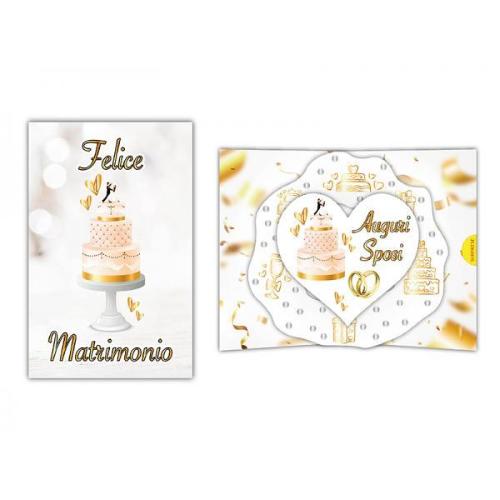Per un giorno così importante, serve un augurio che sia all'altezza, un piccolo tesoro che gli sposi possano conservare per sempre. Questo biglietto è un concentrato di eleganza e meraviglia. La copertina, con la sua raffinata torta nuziale e i dettagli dorati, preannuncia un messaggio speciale. Ma è all'apertura che si compie la vera magia: un magnifico cuore tridimensionale si apre, svelando al suo interno la torta nuziale, simbolo di dolcezza e festa, circondata da fedi dorate e coriandoli scintillanti. E la sorpresa non è finita. Nascosta con discrezione, la tasca "Surprise" contiene un bigliettino estraibile, lo spazio perfetto per le tue parole più personali, preservando la bellezza della scena 3D. È il modo più elegante e memorabile per augurare agli sposi una vita colma di amore e felicità.