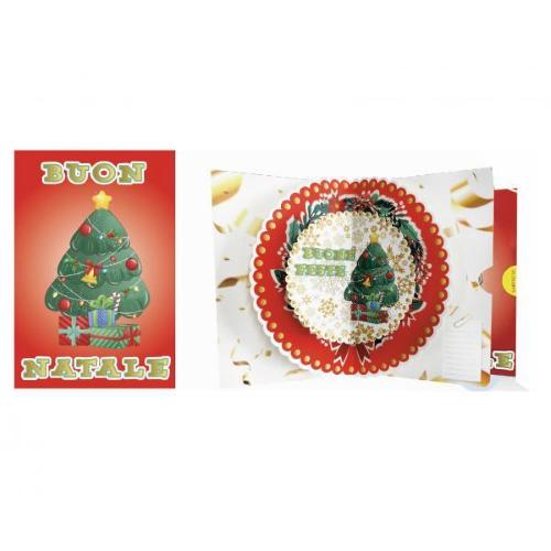 Interno: Scena pop-up 3D con albero, ghirlanda e scritta "Buone Feste", spazio a lato per una dedica personale.