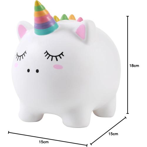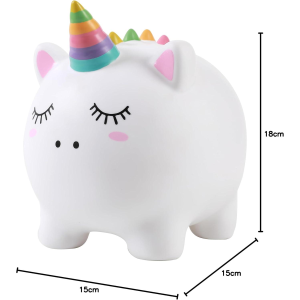 Porta la magia del risparmio nella tua casa con questo incantevole salvadanaio a forma di unicorno! Con le sue dimensioni generose (24x15x18 cm), offre ampio spazio per raccogliere monete, banconote e realizzare tutti i tuoi desideri. Realizzato in PVC resistente, questo portamonete fantastico cattura lo sguardo con il suo corno arcobaleno, la criniera dettagliata e i vivaci colori pastello.