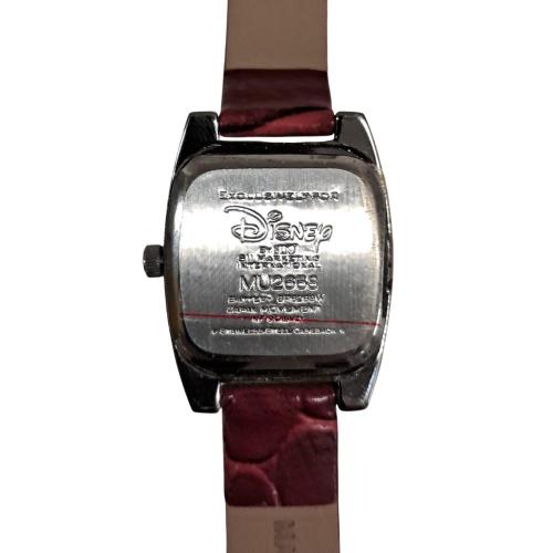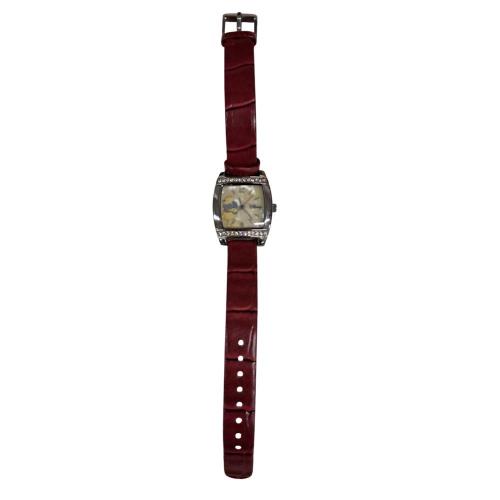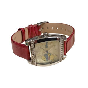 Il protagonista è il cinturino in similpelle color Rosso Bordeaux (Burgundy), una tonalità calda ed elegante arricchita dalla texture effetto pelle. La cassa argentata quadrata brilla grazie agli inserti di strass posizionati sopra e sotto il quadrante, creando un effetto gioiello. Il fondo in madreperla naturale offre riflessi unici, su cui si staglia l'immagine di Winnie con i suoi fiori blu. Un orologio che non è solo un segnatempo, ma un piccolo pezzo di storia Disney da custodire gelosamente. Perfettamente conservato e funzionante.
